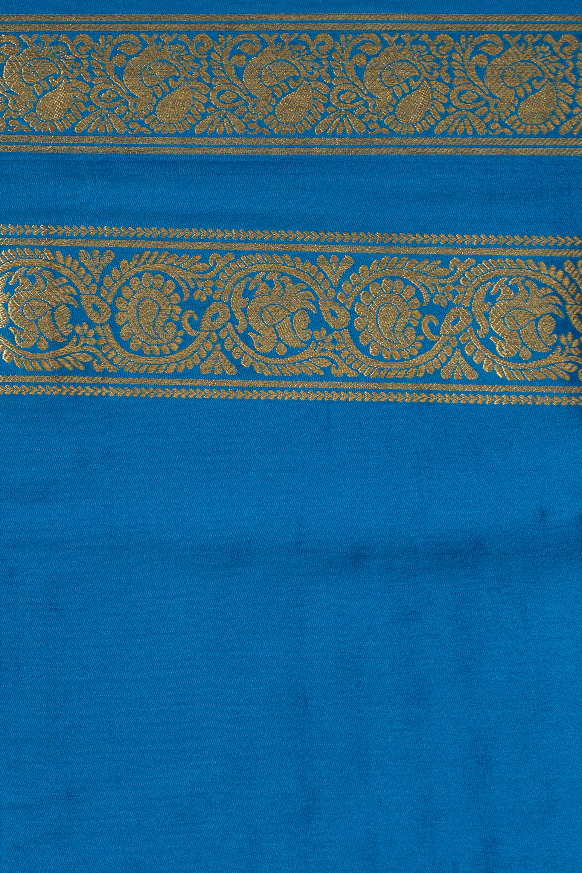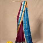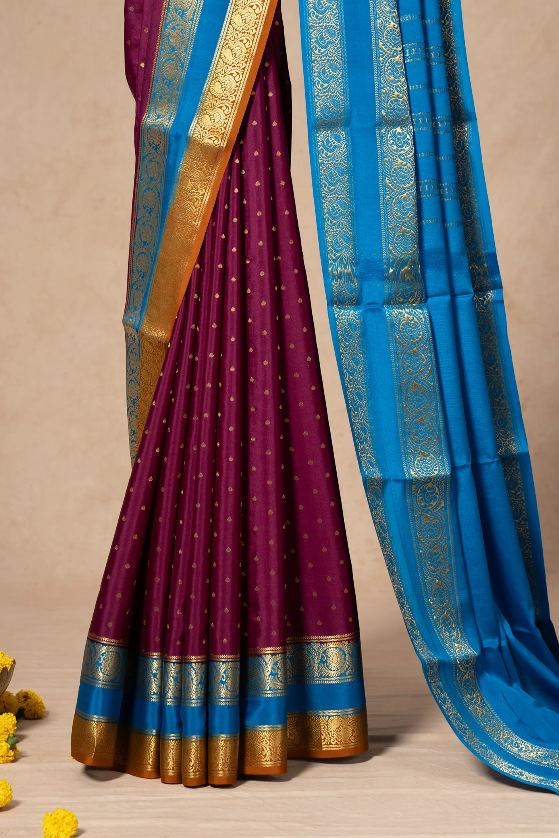This Jamoon purple mysore silk saree features a striking two-colour border with golden zari. The body is adorned with subtle gold buttas, while the sky blue pallu showcases detailed traditional patterns that add a regal charm. Perfect for festive occasions and celebrations, this saree brings together elegance, colour, and timeless craftsmanship.