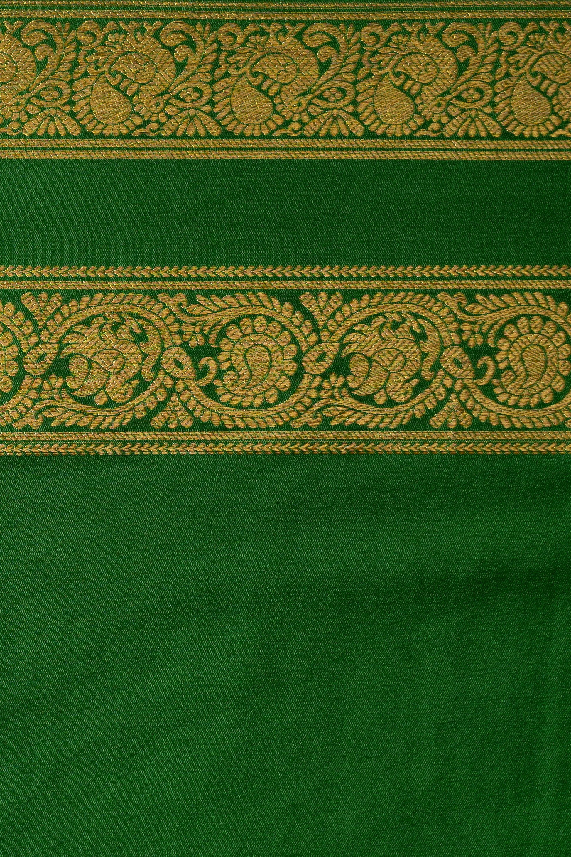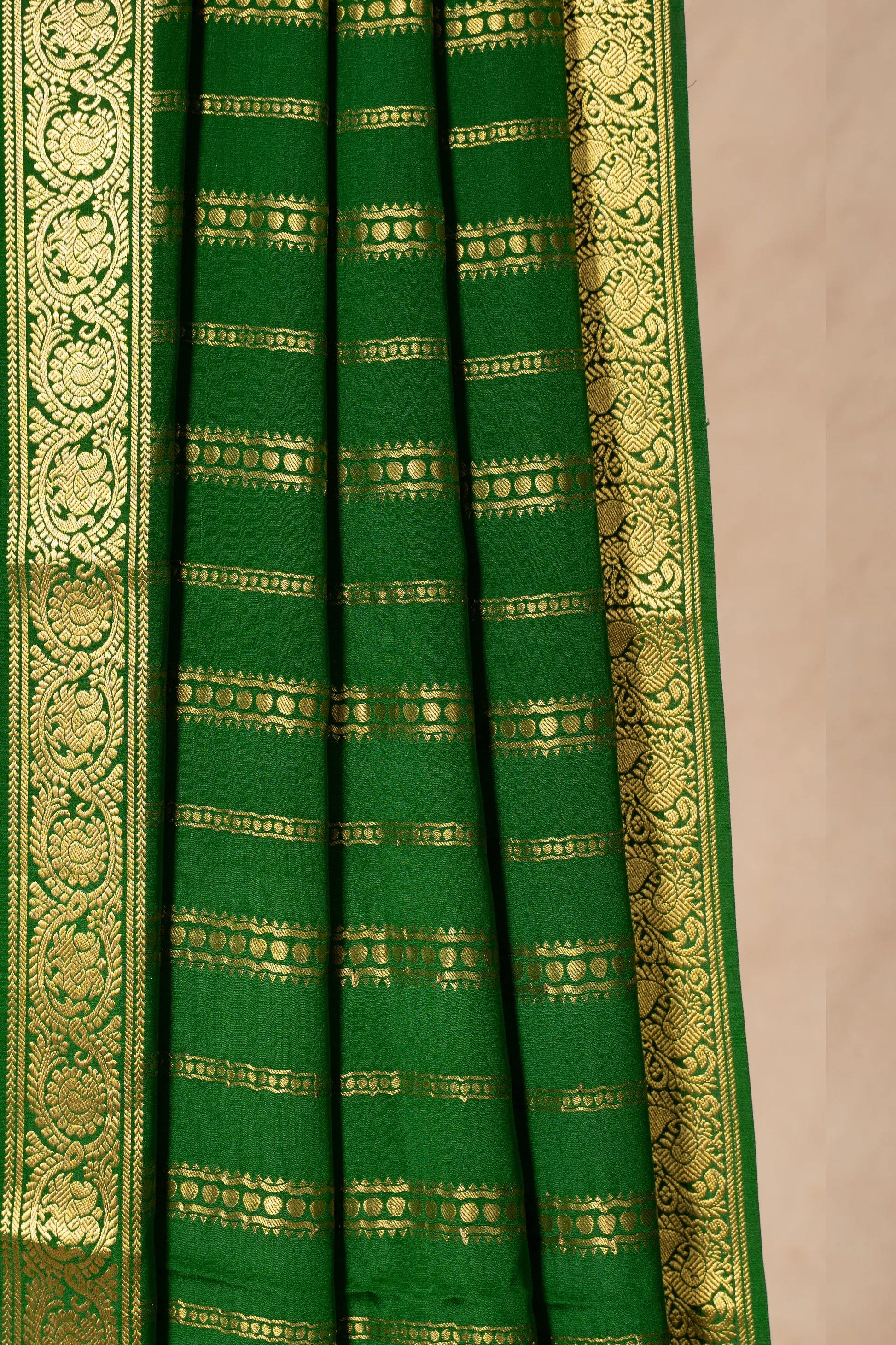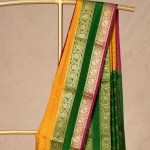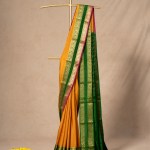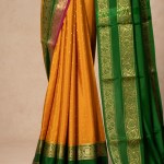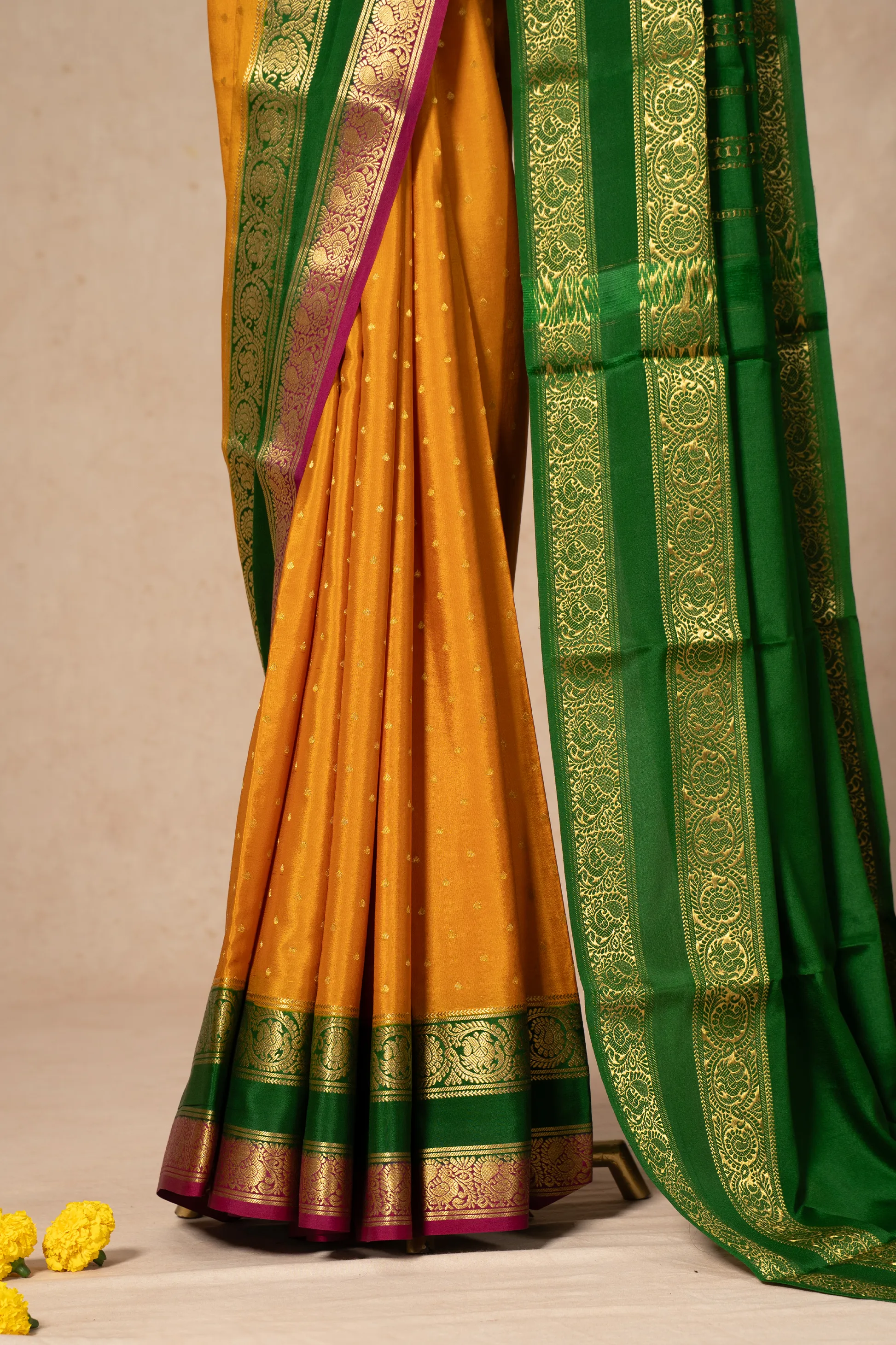 This Mustard Yellow mysore silk saree features a striking two-colour border with golden zari. The body is adorned with subtle gold buttas, while the green pallu showcases detailed traditional patterns that add a regal charm. Perfect for festive occasions and celebrations, this saree brings together elegance, colour, and timeless craftsmanship.