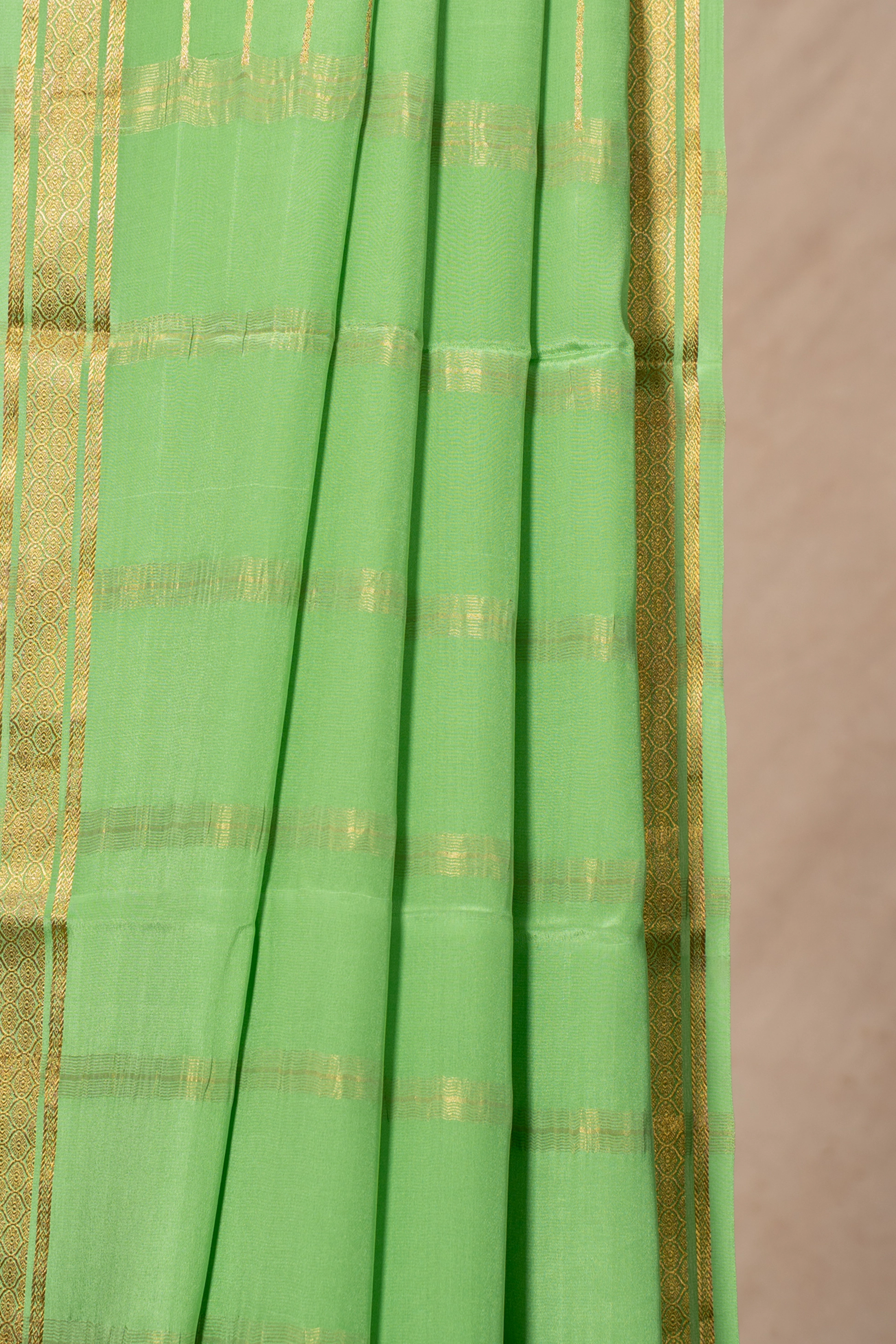 This pista green Mysore silk sareewith all over lines feels soothing the moment you wear it. The elegant border adds a clean finish that highlights the saree’s soft colour. Easy to drape and it suits festive mornings, temple visits, or family events where you prefer a traditional look that is comfortable and charming.