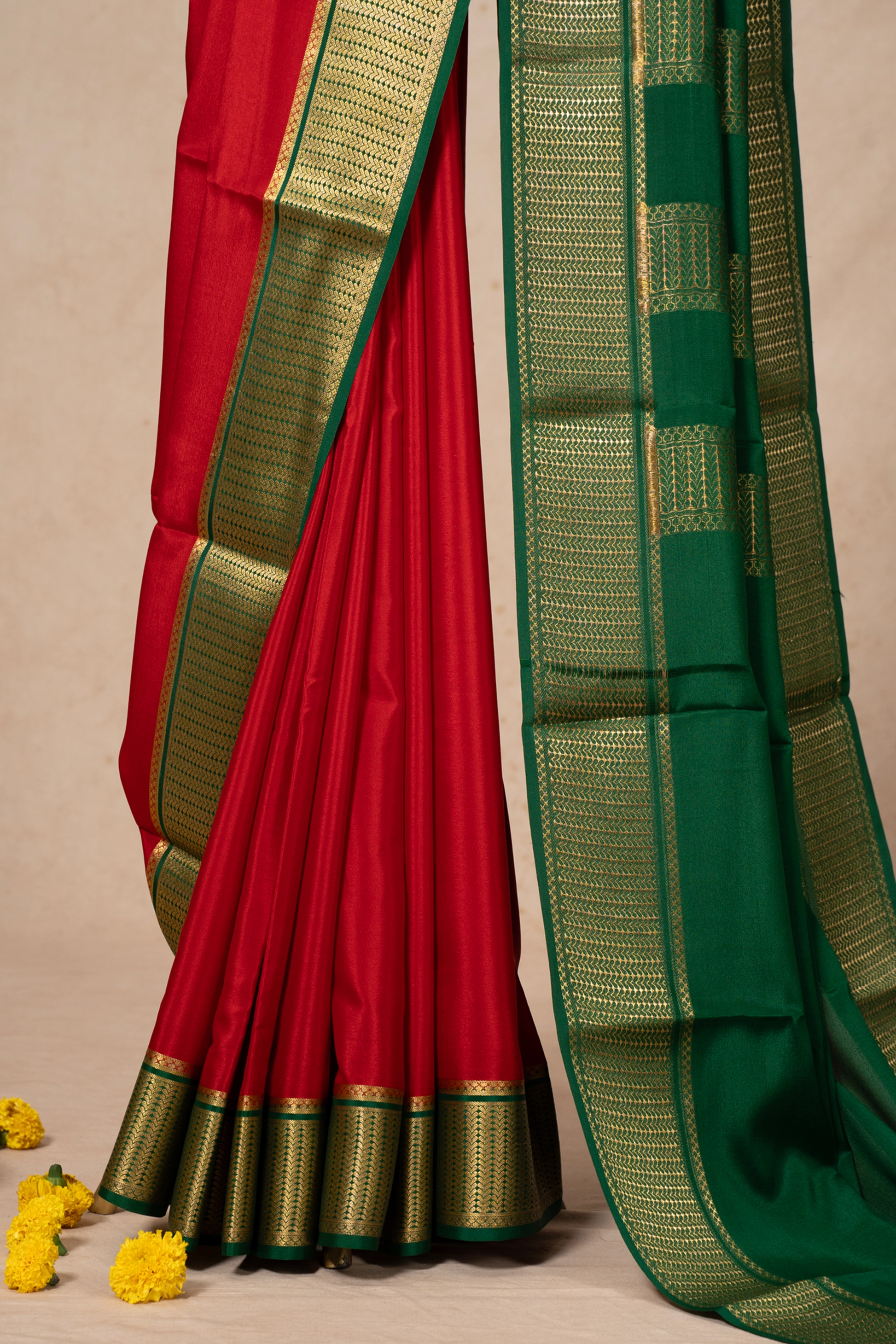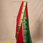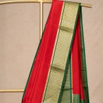This striking red mysore silk saree green pallu, highlighted beautifully by golden zari border. The border features intricate traditional motifs that add a regal touch to the overall look. Perfect for festive occasions, weddings, and cultural events, this saree brings a classic charm and refined elegance to any wardrobe.