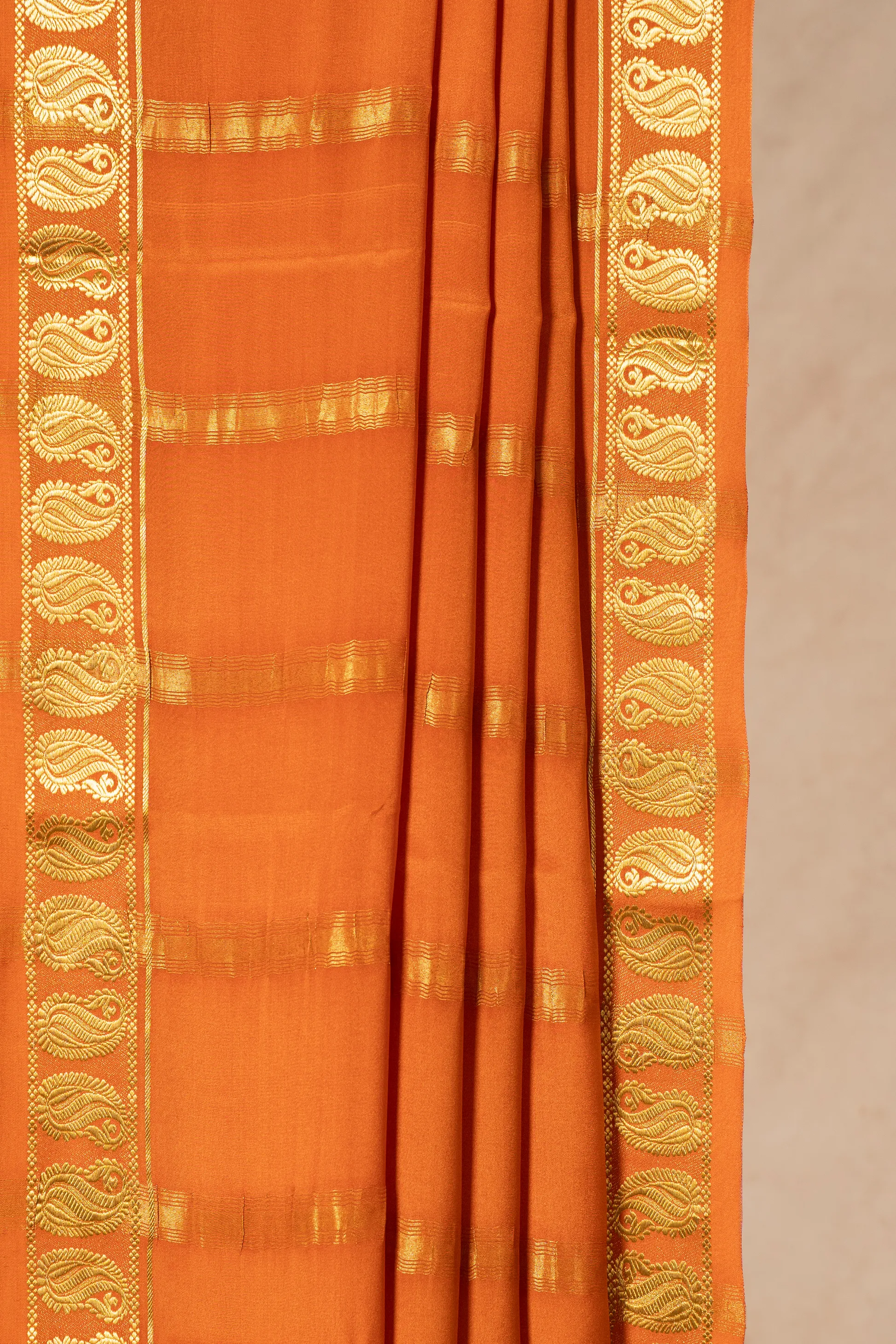 This beautiful rust mysore silk saree features a golden zari border adorned with classic mango motifs. The pallu carries subtle gold accents that add a refined traditional touch. Perfect for festive celebrations, weddings, and special occasions, this saree brings understated elegance and timeless charm to any collection.