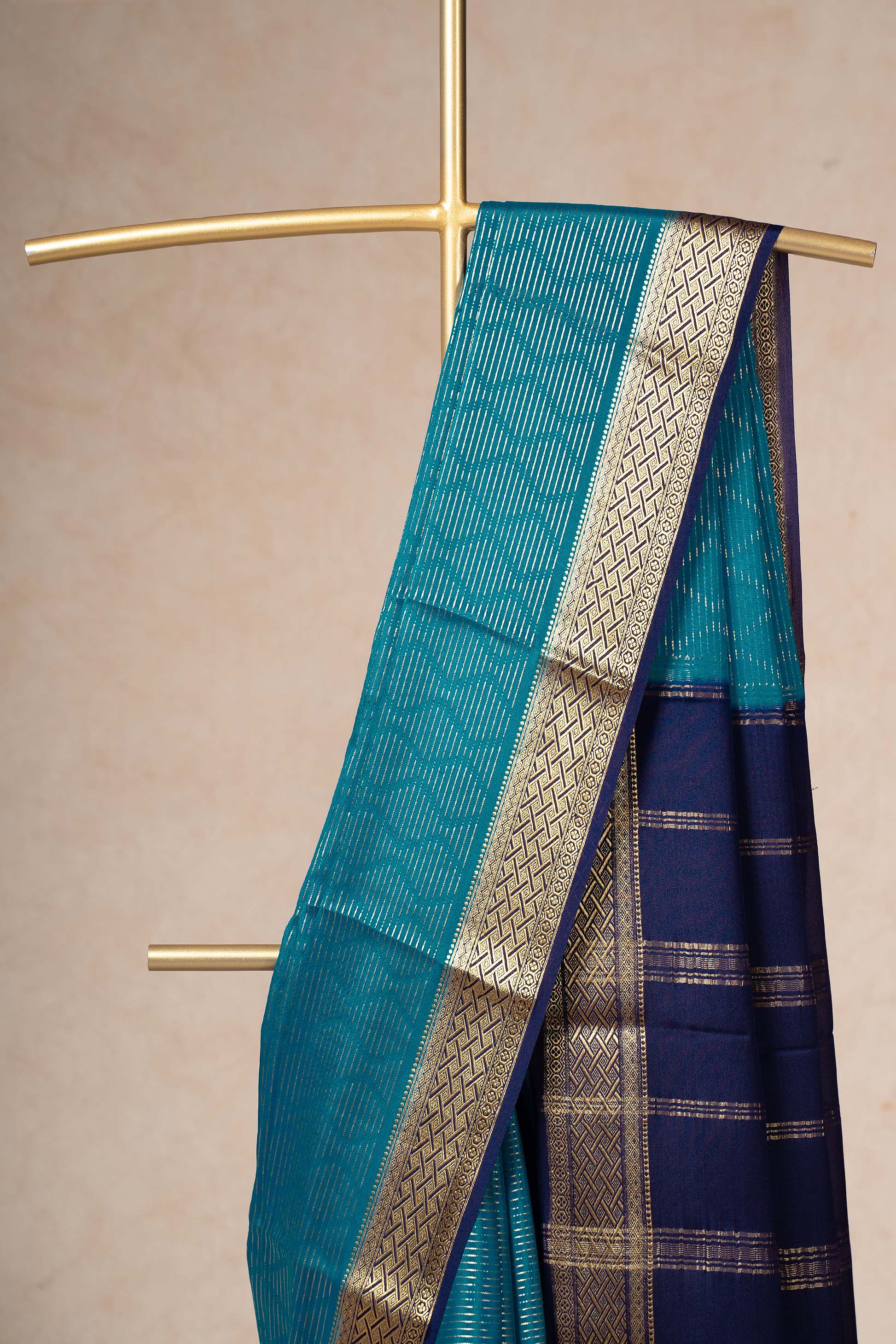 This Peacock blue Mysore Silk saree captures attention with classic gold zari border throughout its lustrous fabric. The intricate gold border adds a regal touch, suitable for weddings and special occasions. The saree's rich color and detailing create a sophisticated ensemble.