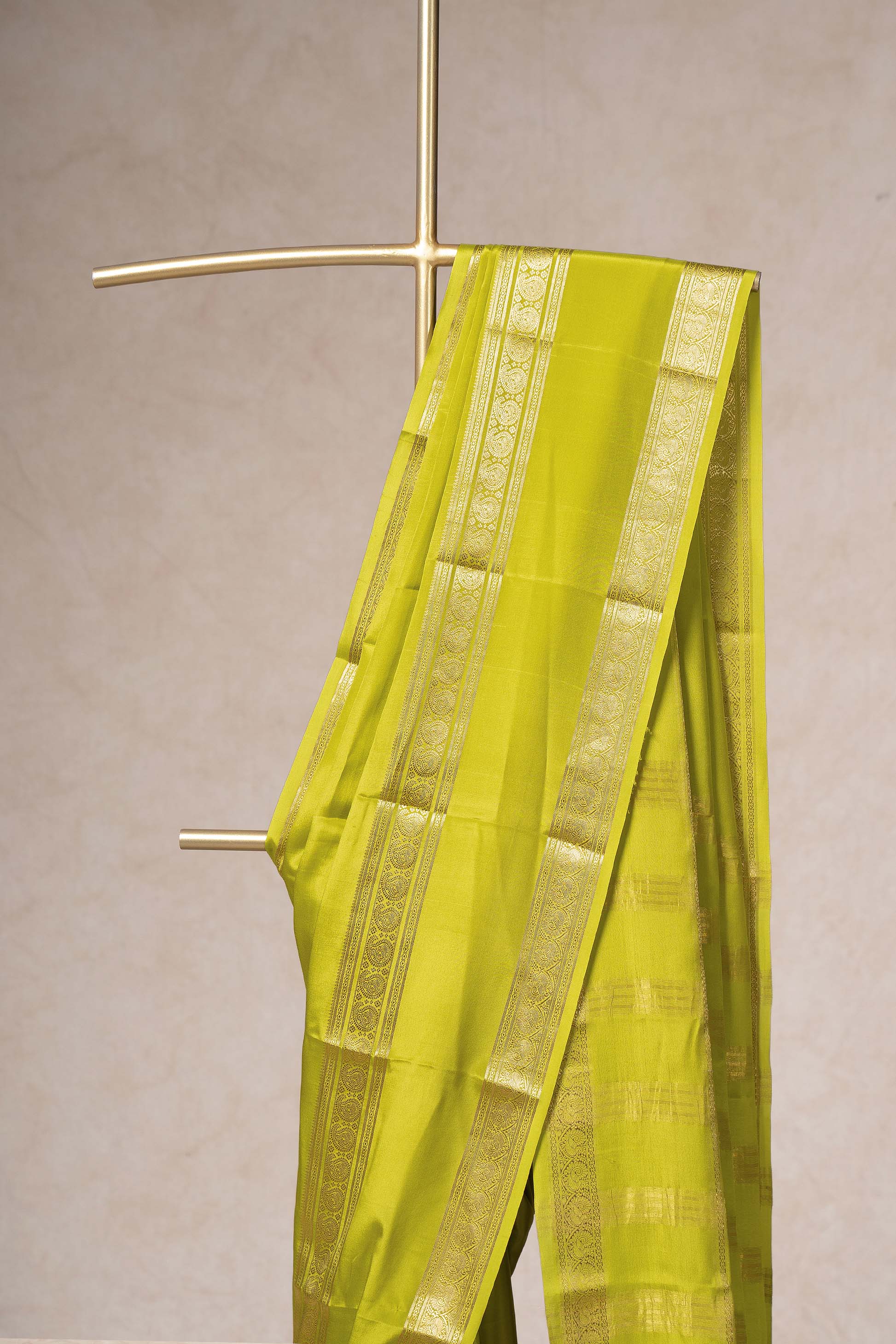 This Mysore Silk saree in a rich yellow-green features a delicate gold zari border that enhances its luxurious feel. The gold border frames the saree beautifully, adding a touch of tradition and sophistication. Perfect for celebrations where elegance matters.