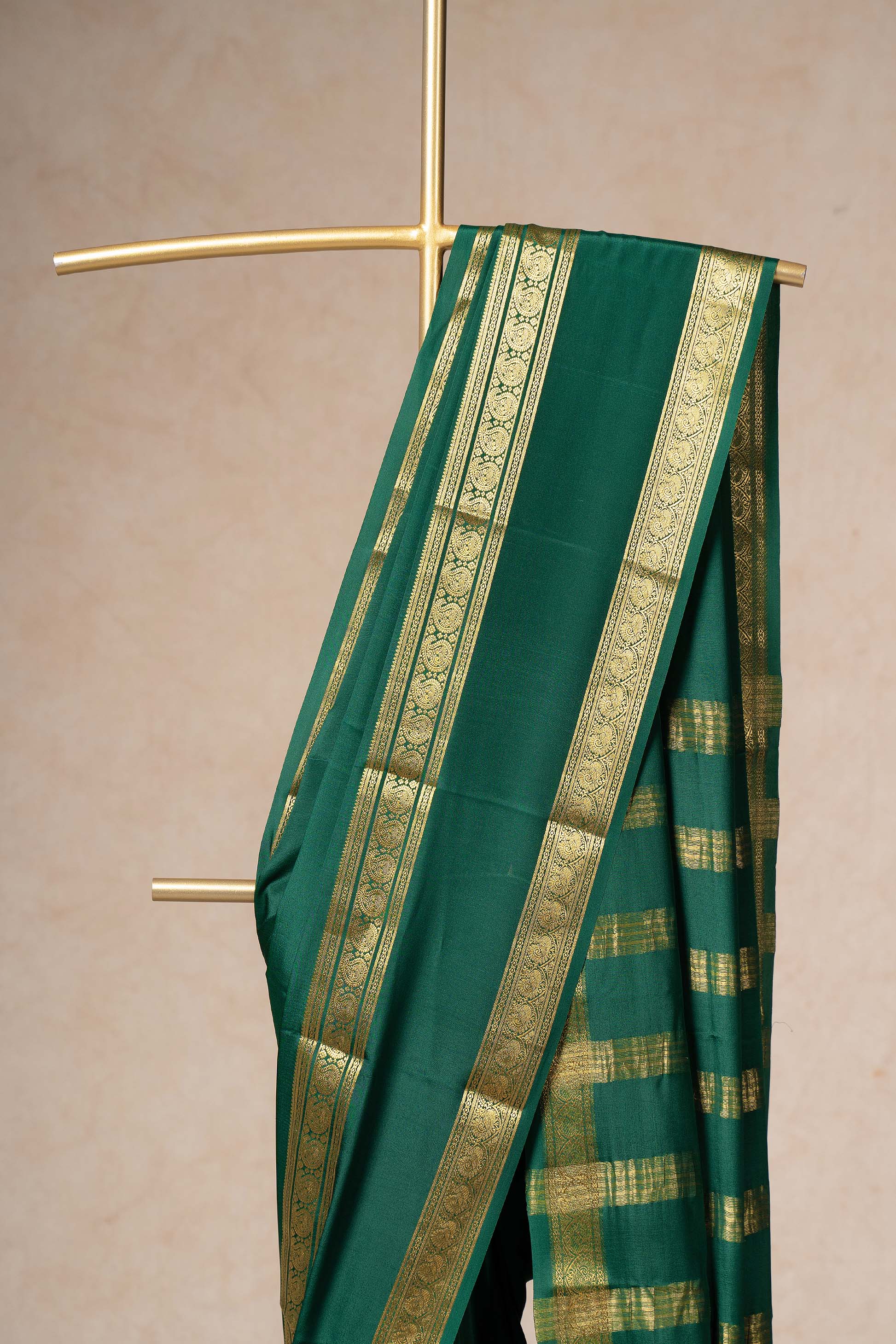 In a lively shade of bottle green, this Mysore silk saree is woven with intricate gold zari patterns that add depth and sparkle. The double zari border frames the saree beautifully, perfect for traditional occasions. Its soft texture and vibrant hue make it a festive favorite that blends comfort with elegance.