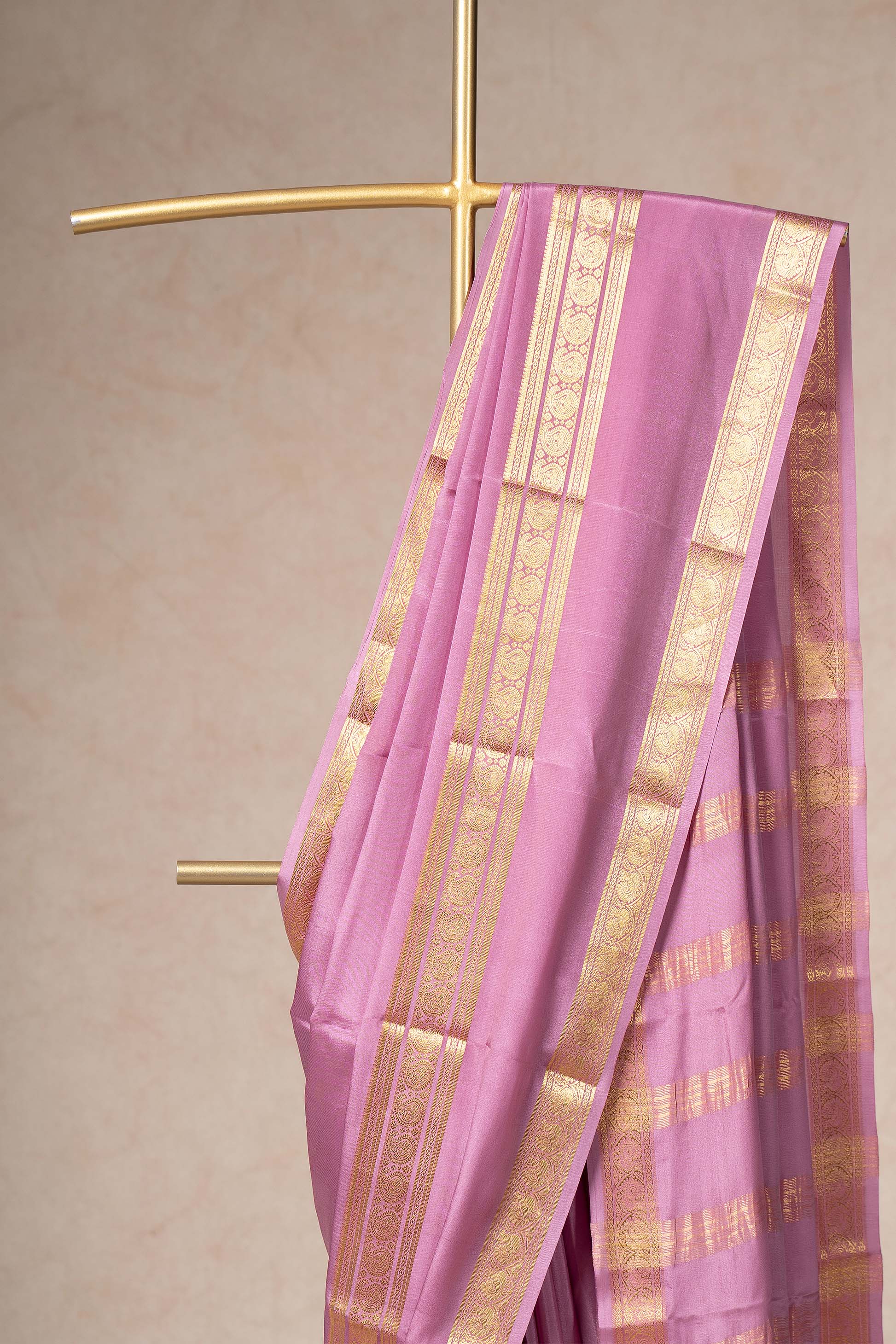 This charming pink Mysore silk saree features beautiful gold zari stripes work that sparkles softly in the light. Its broad gold border enhances the traditional design, making it perfect for family gatherings and festive celebrations. The silk’s natural sheen adds to its elegant appeal.