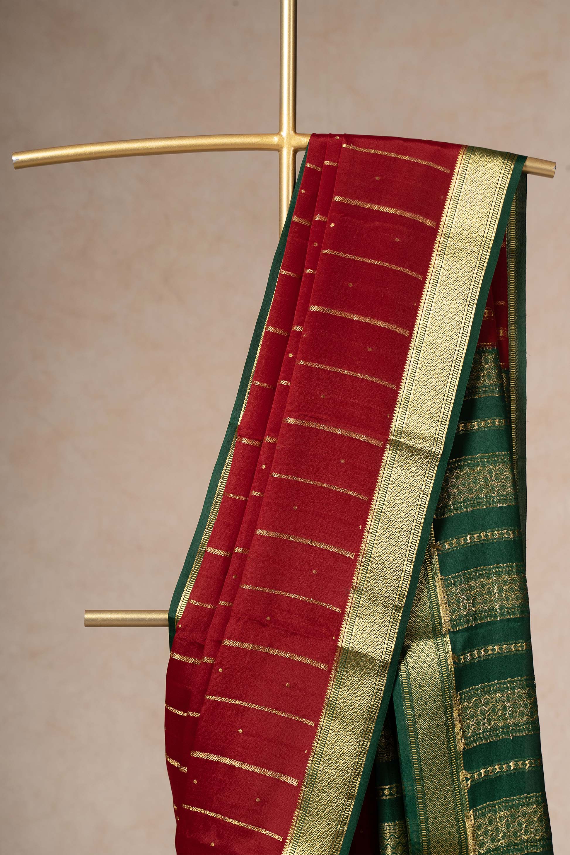 This deep red Mysore Silk saree is bold and timeless. The golden zari stripes add shimmer without overwhelming, while the broad gold border stands out, giving it a regal aura. It’s a must-have for bridesmaids, religious ceremonies, or cultural functions.