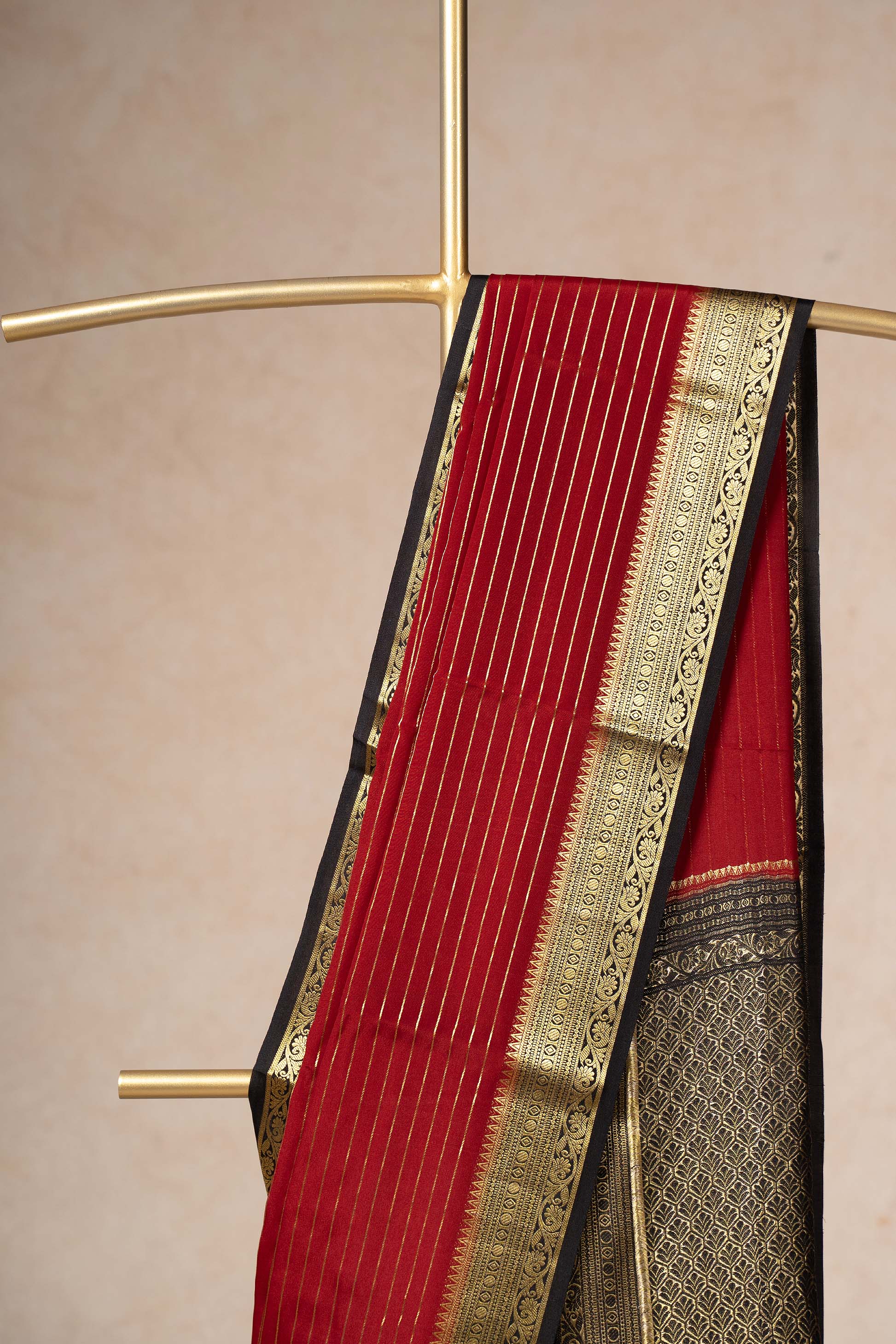 This deep red Mysore Silk saree stands out with its fine zari stripes and lustrous finish. The gold zari border enhances its classic appeal, making it ideal for weddings and celebrations. The saree’s vibrant shade and intricate patterns create a timeless look.